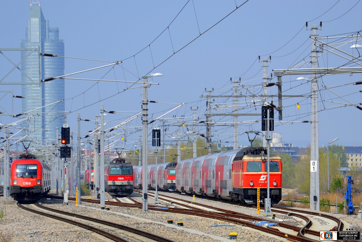 | Электровоз серии 1144 на путях отстоя, электровоз "Таурус" 1116-124 (слева) с региональным экспрессом, станция Вена-Пратерштерн, Австрия Автор: Алекс | Фото сделано 5.IV.2012, опубликовано 13.III.2013.