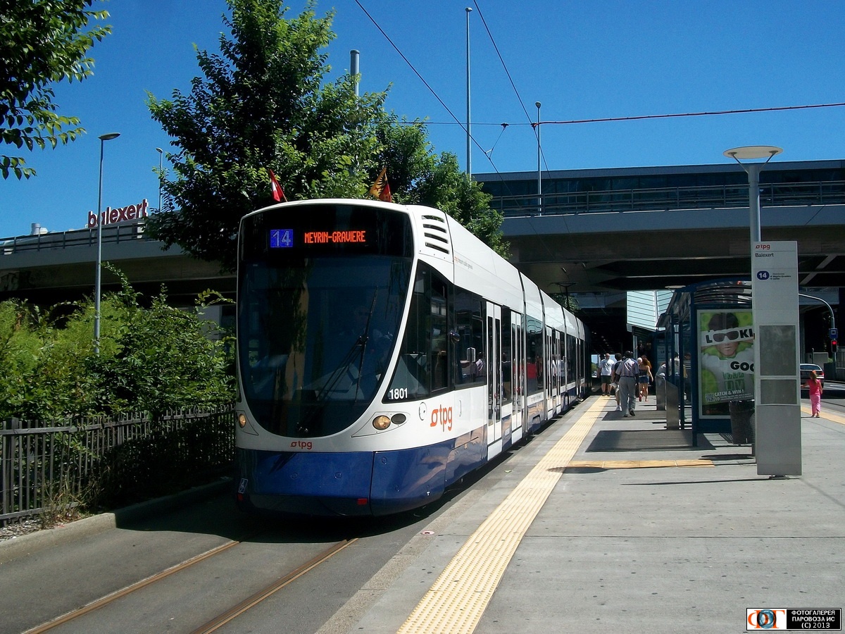 | Трамвай Stadler Tango подъезжает к остановке "Балексер", Женева, Швейцария Автор: Viggen | Фото сделано 8.VIII.2012, опубликовано 27.IV.2013.