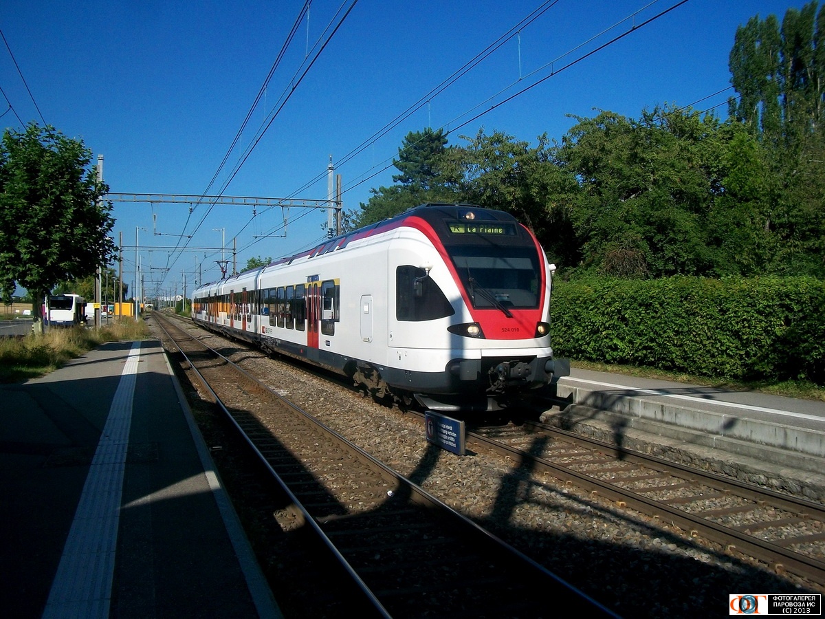 | Электропоезд Stadler FLIRT RABe 524-010 подъезжает к о.п. Сатиньи, Швейцария Автор: Viggen | Фото сделано 11.VIII.2012, опубликовано 11.V.2013.