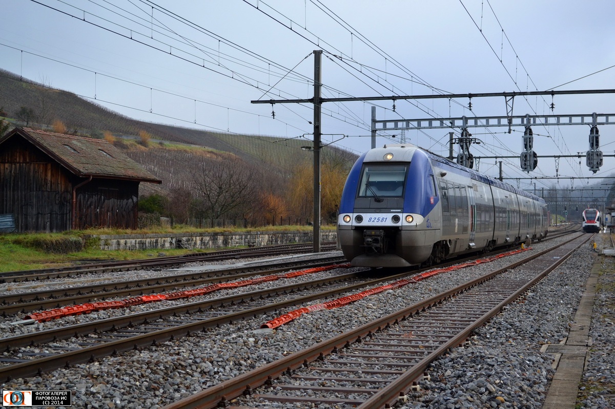 | Дизель-электропоезд В 82-581 сообщением Женева - Гренобль проходит станцию Ла-Плен, Швейцария Автор: Viggen | Фото сделано 30.XII.2013, опубликовано 11.VII.2014.