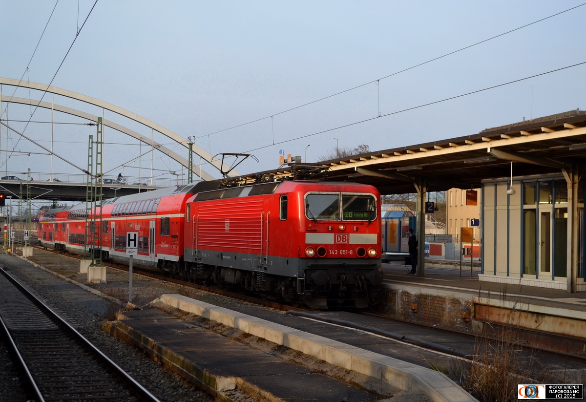 | Электровоз 143-651 в составе регионального поезда RE13 сообщением Дессау - Лейпциг на станции Дессау, Германия/Саксония-Ангальт Автор: Viggen | Фото сделано 25.III.2015, опубликовано 3.IV.2015.