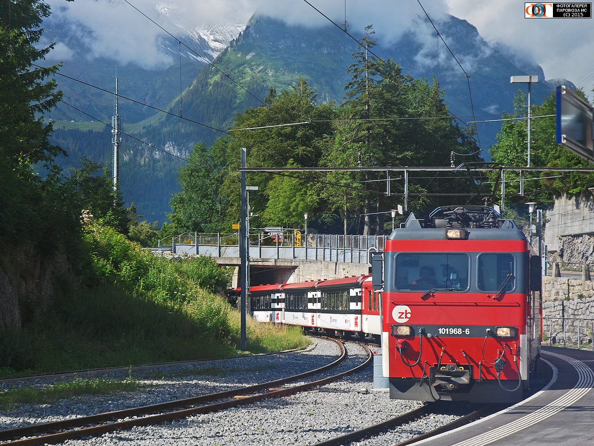 | Электровоз HGe 4/4 101968-6 с пассажирским поездом на ст. Брюниг-Хаслиберг, Швейцария Автор: AZ | Фото сделано 25.VII.2011, опубликовано 11.IX.2015.