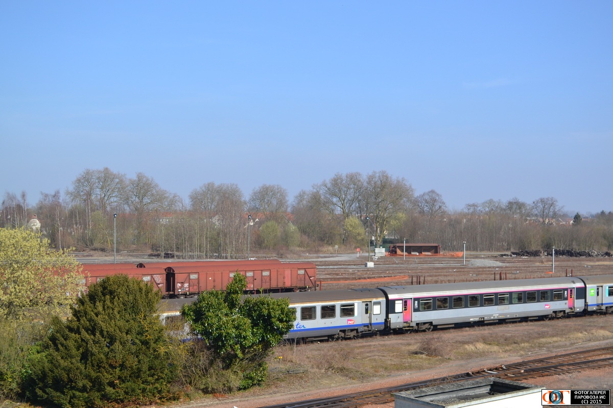 | Пассажирские и грузовые вагоны в отстое на станции Лаон, Франция Автор: Viggen | Фото сделано 8.III.2014, опубликовано 23.X.2015.