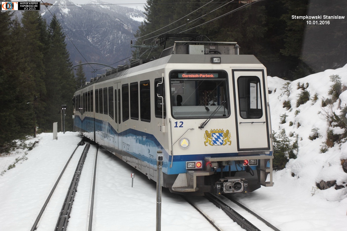| Электропоезд Stadler зубчатой дороги Байерише-Цугшпитцбан (Bayerische Zugspitzbahn Bergbahn BZB Deutschland; фото из задней кабины встречного поезда). Промежуточная остaновка Риффельрисс (Riffelriss), Германия/Бавария Автор: Стемпковский С. | Фото сделано 9.I.2016, опубликовано 11.I.2016.