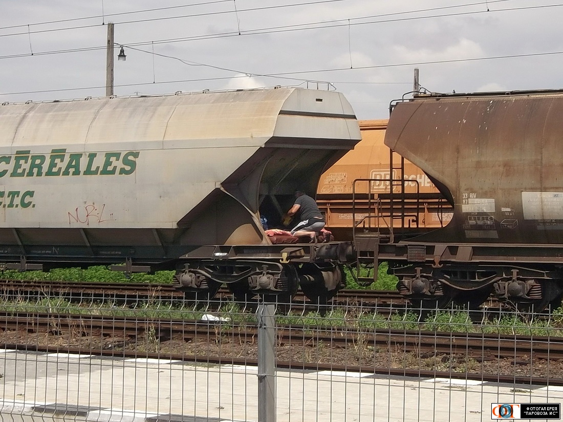| "Зацепер" на вагоне-зерновозе в проходящем составе, ст. Тимишоара-Норд, Румыния Автор: Ал | Фото сделано 19.VI.2016, опубликовано 25.VIII.2016.