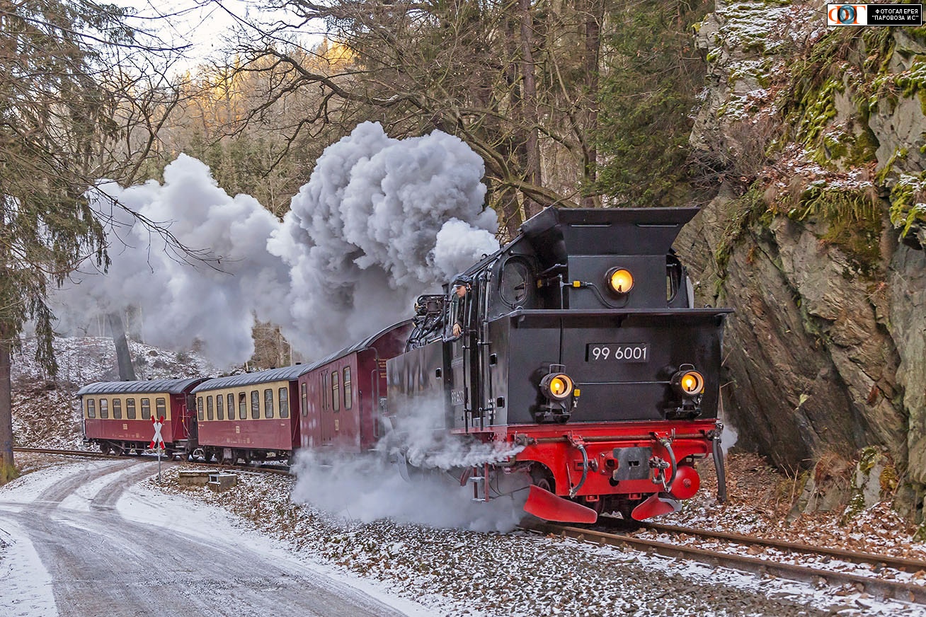 | Паровоз BR99-6001 с пассажирским поездом на перегоне Алексисбад - Mегдешпрунг (Alexisbad - Mägdesprung), Германия/Саксония-Ангальт Автор: Dmittri | Фото сделано 6.I.2017, опубликовано 24.II.2017.