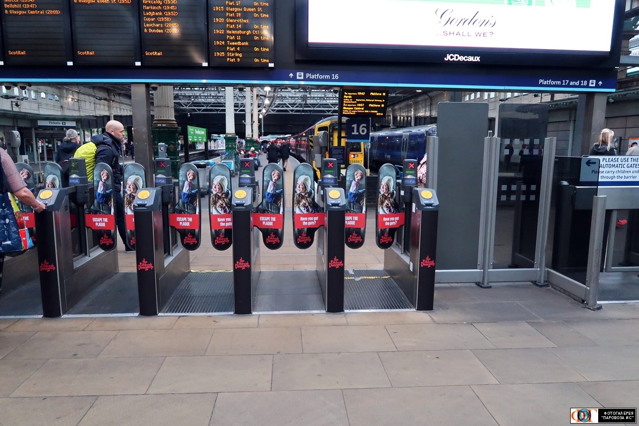 | Турникеты перед пассажирскими платформами, ст. Эдинбург, Великобритания Автор: Эйнарс | Фото сделано 2.VIII.2017, опубликовано 11.IX.2017.