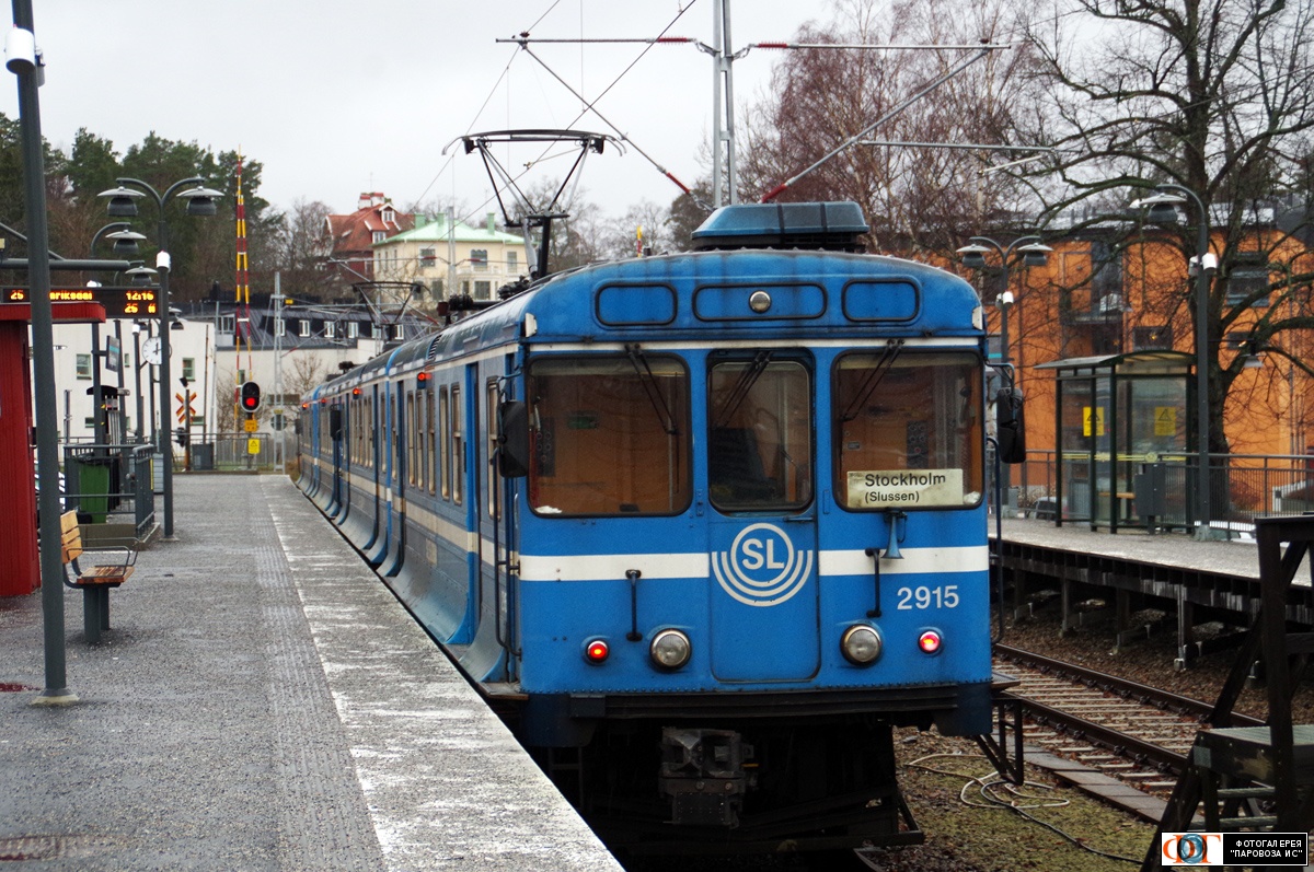 | Электропоезд местной железной дороги (Saltsjöbanan) с головным вагоном №2915, линия L25, станция Сальтсьёбаден (Saltsjöbaden station), г. Стокгольм, Швеция Автор: tallart | Фото сделано 4.I.2018, опубликовано 1.II.2018.