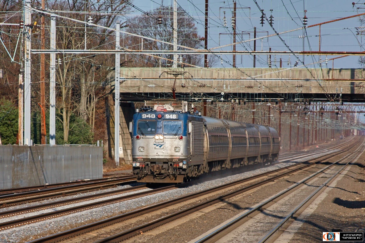 | Электровоз AEM7 № 948 компании "Amtrak". ст. Принстон-Джанкшн, Вест Виндзор, США/Нью-Джерси Автор: Александр Белоусов | Фото сделано 22.XI.2009, опубликовано 24.V.2020.