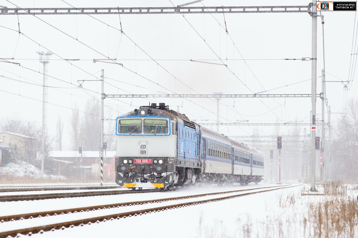| Тепловоз 754.086-7 с пассажирским поездом Os3132 на станции Острава-Главный вокзал, Чехия Автор: ES499 | Фото сделано 16.I.2021, опубликовано 17.I.2021.