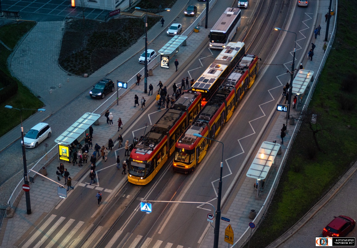| Трамваи PESA 121N-3827 и PESa Jazz 134N-3250 на остановке Старый Город, Варшава, Польша Автор: Прикарпатский партизан | Фото сделано 1.III.2020, опубликовано 18.XI.2021.