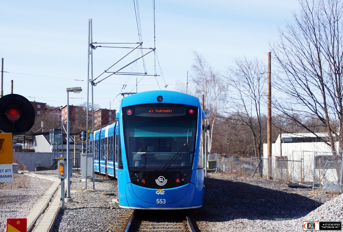 | Трамвай CAF Urbos AXL №553, ст. Ропстен Лидингёбана, Стокгольм, Швеция Автор: tallart | Фото сделано 12.IV.2022, опубликовано 24.IV.2022.