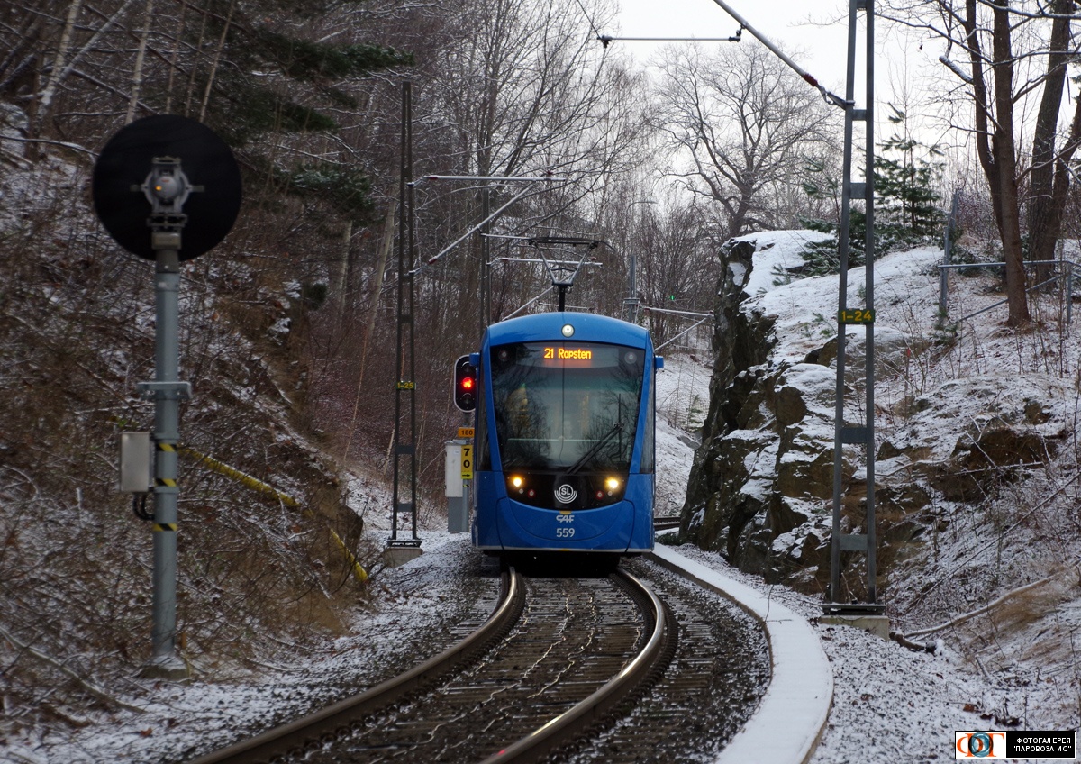 | Трамвай CAF Urbos AXL №559, перегон "Багеби" (Baggeby) - "Торсвик" (Torsvik) Лидингёбана, муниципалитет Лидингё, Швеция Автор: tallart | Фото сделано 23.I.2023, опубликовано 18.IX.2023.