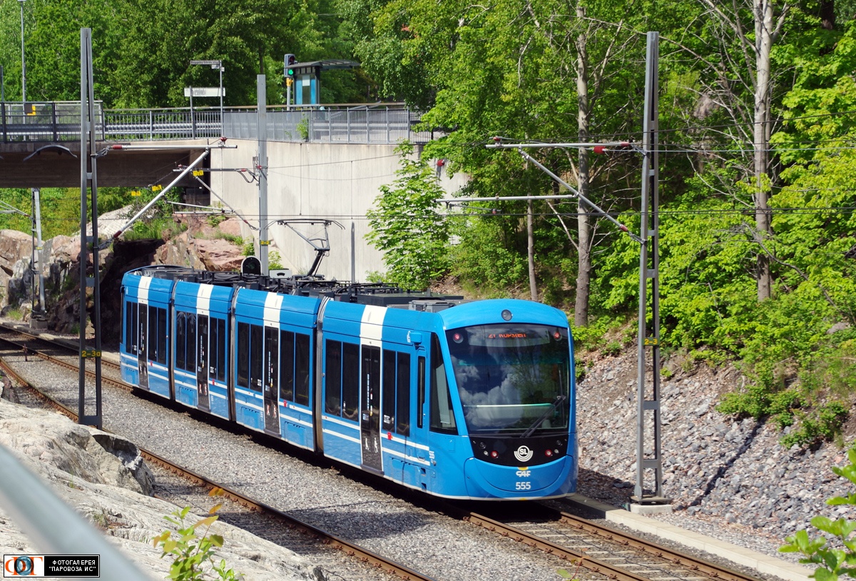 | Трамвай CAF Urbos AXL №555, ст. "Багеби" (Baggeby) Лидингёбана, муниципалитет Лидингё (Lidingö), Швеция Автор: tallart | Фото сделано 1.VI.2022, опубликовано 2.XII.2023.