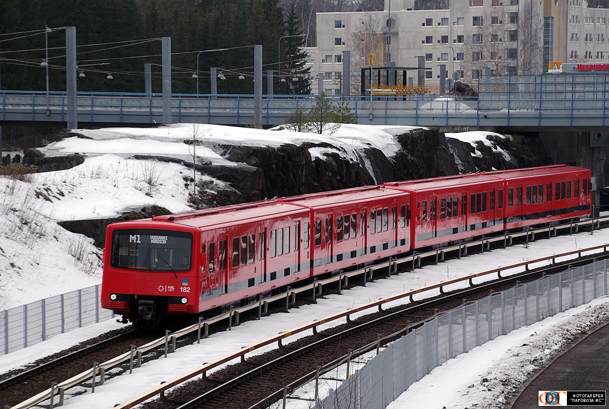 | Метропоезд Valmet M100 № 182, перегон Растила - Вуосаари (Rastila - Vuosaari), Хельсинки, Финляндия Автор: tallart | Фото сделано 24.II.2024, опубликовано 6.III.2024.