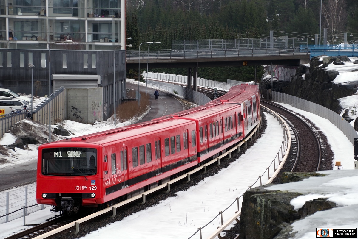 | Метропоезд Valmet M100 № 129, перегон Растила - Вуосаари (Rastila - Vuosaari), Хельсинки, Финляндия Автор: tallart | Фото сделано 24.II.2024, опубликовано 17.VII.2024.