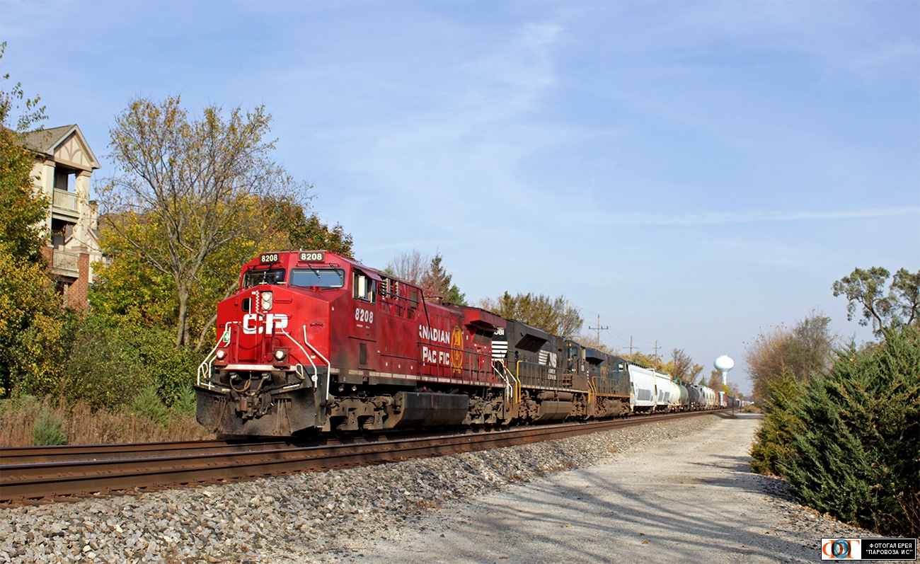 | Тепловозы CP AC4400CW-8208, NS SD70ACe-1081 и CSX ES44AC-984 с грузовым поездом. Линия CP, Нортбрук (Northbrook), США/Иллинойс Автор: Роман | Фото сделано 29.X.2024, опубликовано 27.XI.2024.