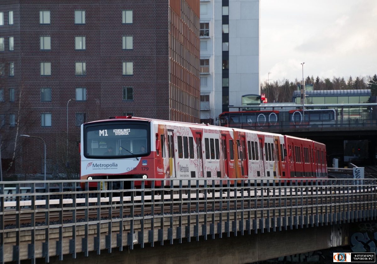 | Метропоезд Valmet M100 № 179, мост Вуосаари (Vuosaaren silta), перегон Растила - Пуотила (Rastilan metroasema - Puotilan metroasema), Хельсинки, Финляндия Автор: tallart | Фото сделано 31.XII.2024, опубликовано 2.V.2025.