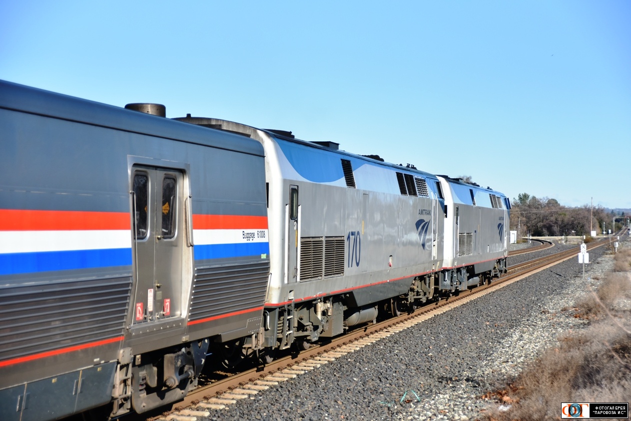 | Тепловозы компании Амтрак GE Genesis P42DC (##170 и 7) ведут пассажирский поезд на перегоне Роклин - Аубурн, США/Калифорния Автор: Ярмолюк Сергей | Фото сделано 6.I.2025, опубликовано 10.IV.2025.