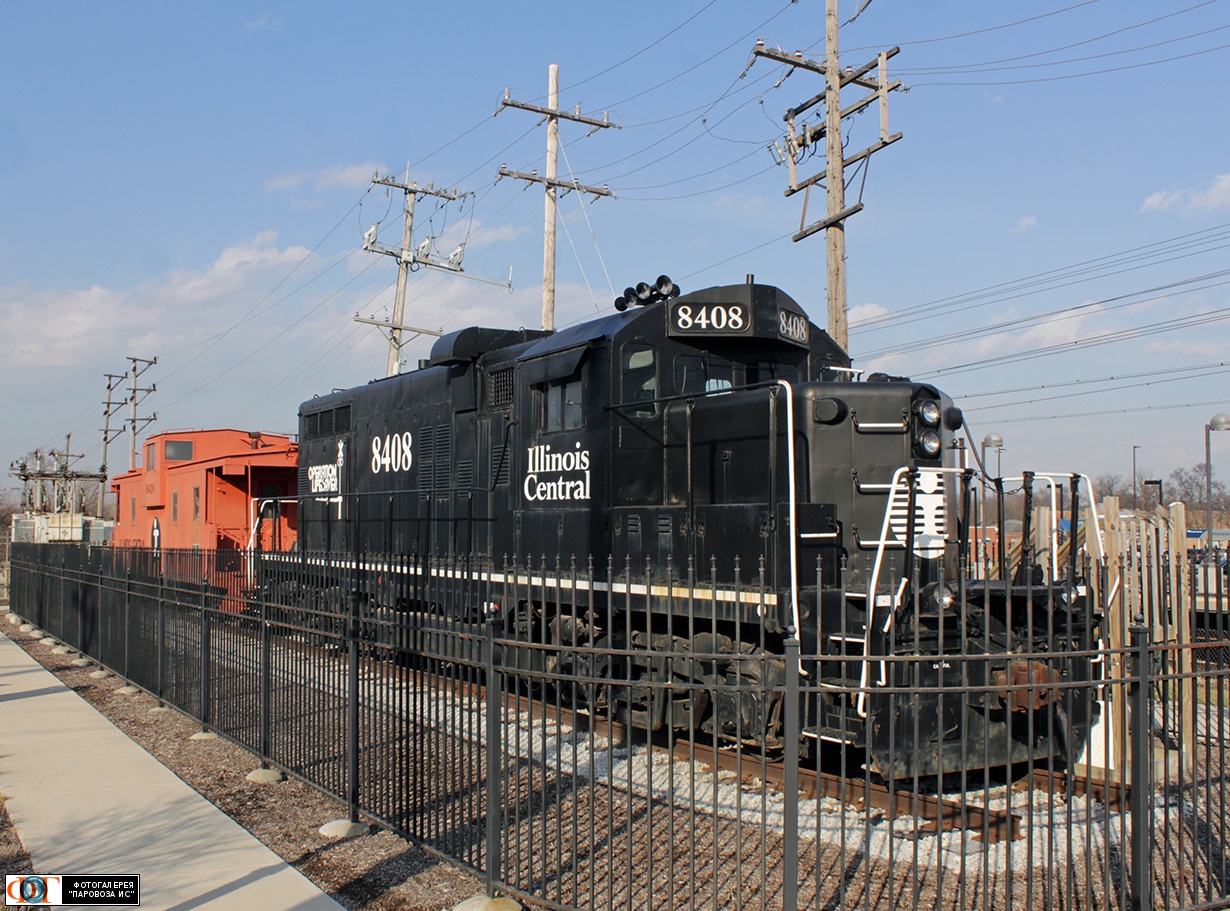 | Тепловоз-памятник компании "Illinois Central" GP10-8408 и вагон-кабуз №9426. Станция Хомвуд (Homewood), США/Иллинойс Автор: Роман | Фото сделано 26.III.2025, опубликовано 10.IV.2025.