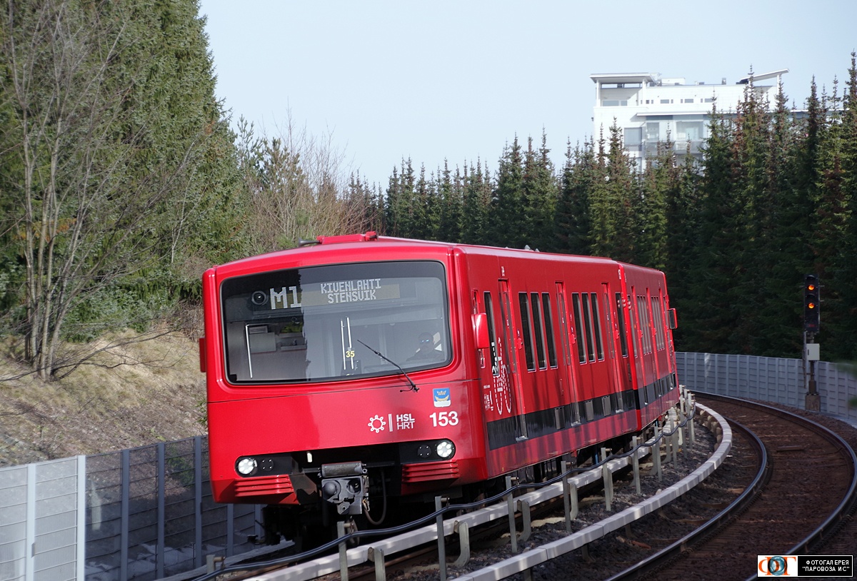 | Метропоезд Valmet M100 № 153, перегон Растила - Вуосаари (Rastila - Vuosaari), Хельсинки, Финляндия Автор: tallart | Фото сделано 27.V.2025, опубликовано 28.V.2025.
