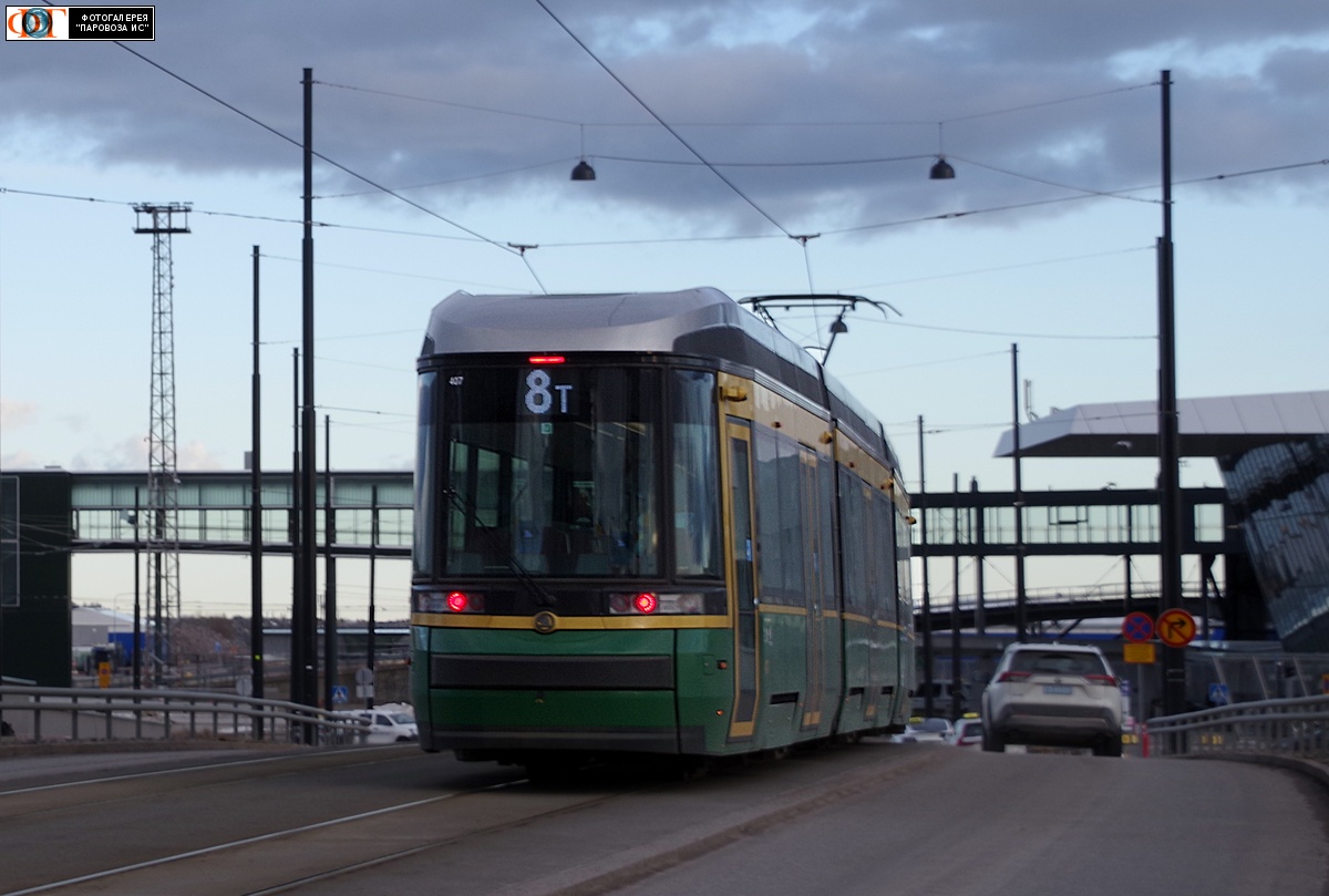 | Трамвай "Шкода" ForCity Smart Artic MLNRV3 № 407, мост Атлантинсилта (Atlantinsilta), Хельсинки, Финляндия Автор: tallart | Фото сделано 16.III.2025, опубликовано 15.VI.2025.