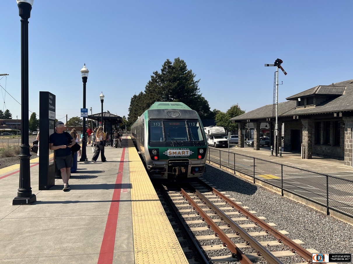 | Дизель-поезд Nippon Sharyo #113 компании SMART сообщением Ларкспёр - Уиндзор на станции Санта Роза, США/Калифорния Автор: Ярмолюк Сергей | Фото сделано 12.VII.2025, опубликовано 23.VIII.2025.