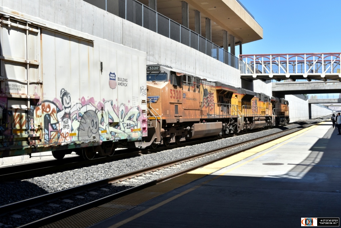 | Тепловозы компании Юнион Пасифик C44AC #5360, SD70AH #8962, и C45ACCTE #5320 с грузовым поездом на станции Рено, США/Невада Автор: Ярмолюк Сергей | Фото сделано 2.VIII.2025, опубликовано 24.VIII.2025.