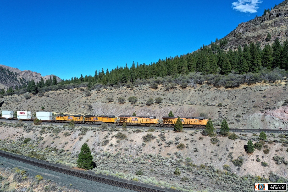 | Тепловозы компании Union Pacific - UP8217 (ES44AC-H); UP2589 (ET44AH); UP6154 (C44ACM); UP4999 (SD-70M) с грузовым поездом в горах Съерра-Невада, США/Калифорния Автор: Ярмолюк Сергей | Фото сделано 25.IX.2022, опубликовано 14.VIII.2025.