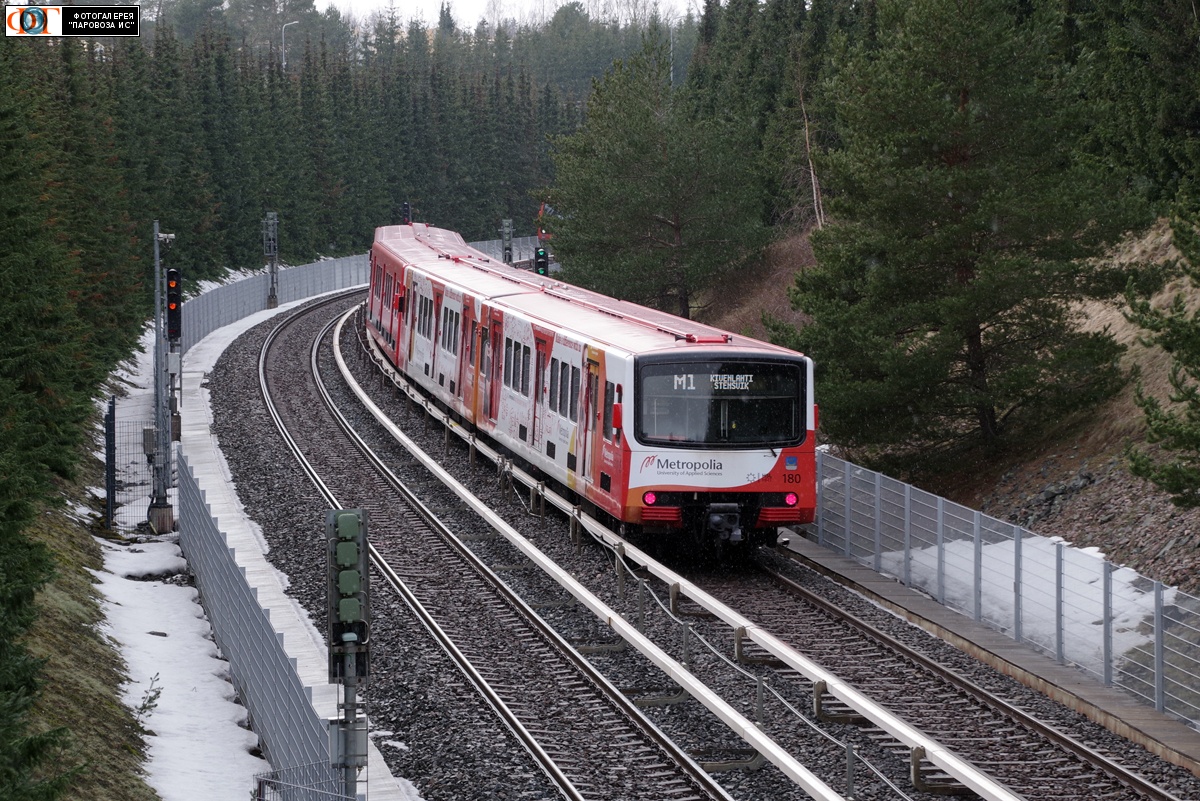 | Метропоезд Valmet M100 № 180, перегон Растила - Вуосаари (Rastila - Vuosaari), Хельсинки, Финляндия Автор: tallart | Фото сделано 26.III.2024, опубликовано 2.IX.2025.