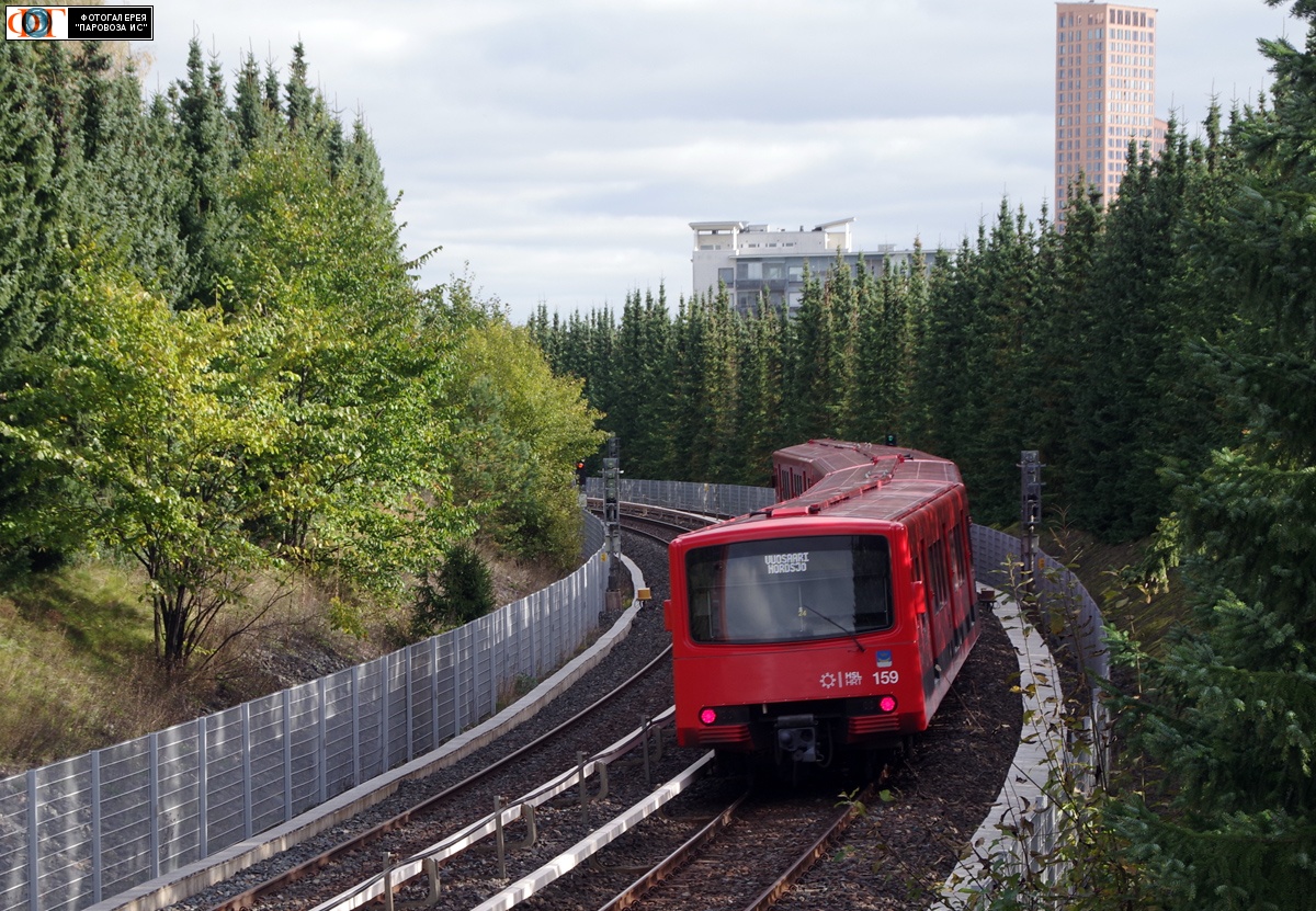 | Метропоезд Valmet M100 № 159, перегон Растила - Вуосаари (Rastila - Vuosaari), Хельсинки (Helsinki), Финляндия Автор: tallart | Фото сделано 29.IX.2025, опубликовано 3.X.2025.