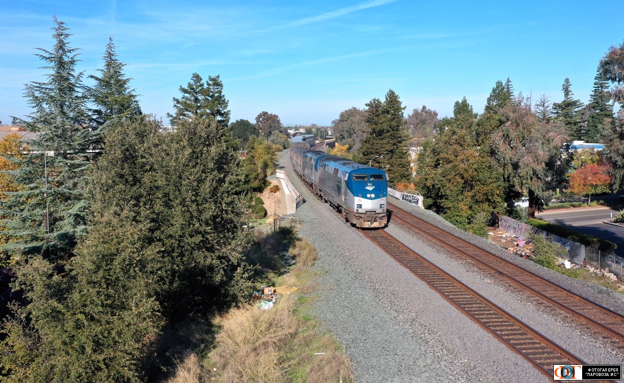 | Тепловозы компании Амтрак GE Genesis P42DC №163 и 50 с пассажирским поездом Чикаго - Эмервилл на перегоне Роузвилл - Сакраменто, США/Калифорния Автор: Ярмолюк Сергей | Фото сделано 8.XI.2025, опубликовано сегодня.