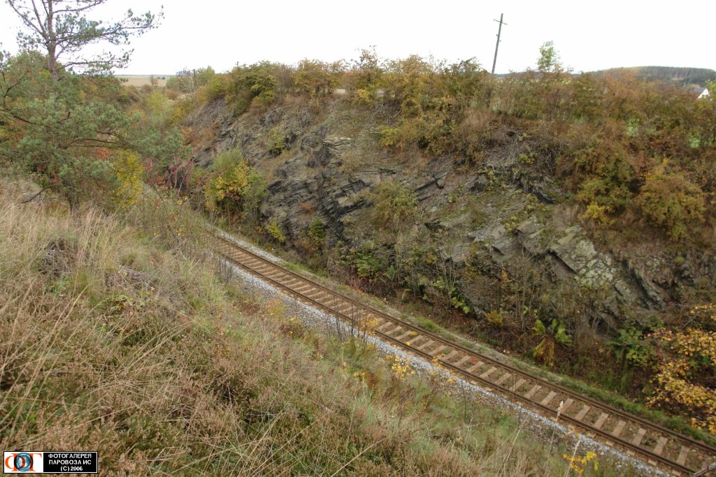 | Железнодорожный путь на Элиасбрунн на фоне каменистого обрыва { Track to Eliasbrunn }, Унтерлемнитц { Unterlemnitz }, Германия/Тюрингия Автор: Сергей Остапенко / Sergej Ostapenko | Фото сделано 24.X.2006, опубликовано 26.X.2006.