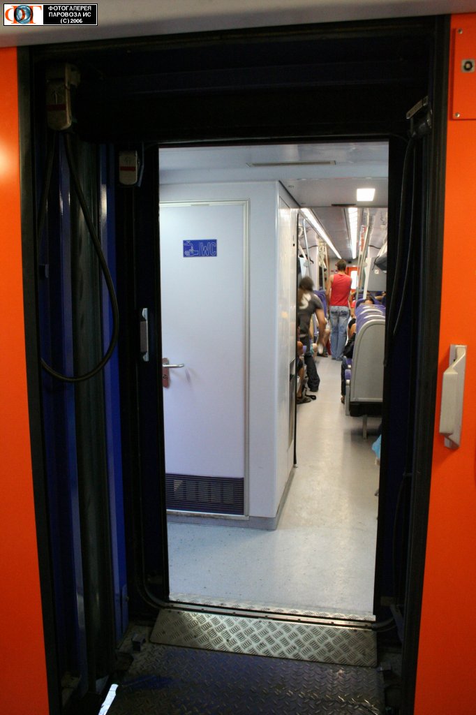 | Межвагонная дверь пассажирского вагона "Бомбардье" { Bombardier coach door }, Греция Автор: Олег | Фото сделано 8.VIII.2006, опубликовано 20.XI.2006.