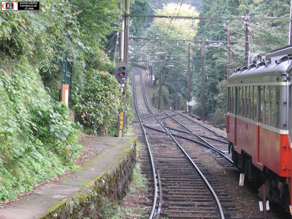 - Максимальный уклон - 80 тысячных. Минимальный радиус кривой - 30 м. Дорога построена в начале прошлого века, вроде как швейцарцами. Колея - 1435 мм. От Одавара до Юмото (это равнинная часть) - совмещенная с японской (три рельса, один общий). ПС достаточно старый, чуть не 50-х годов (точно не знаю), даже без кондиционеров. Есть, впрочем, и более новый. -- Смыслов Валерий (Момубаев Ж., не авторизован(а))