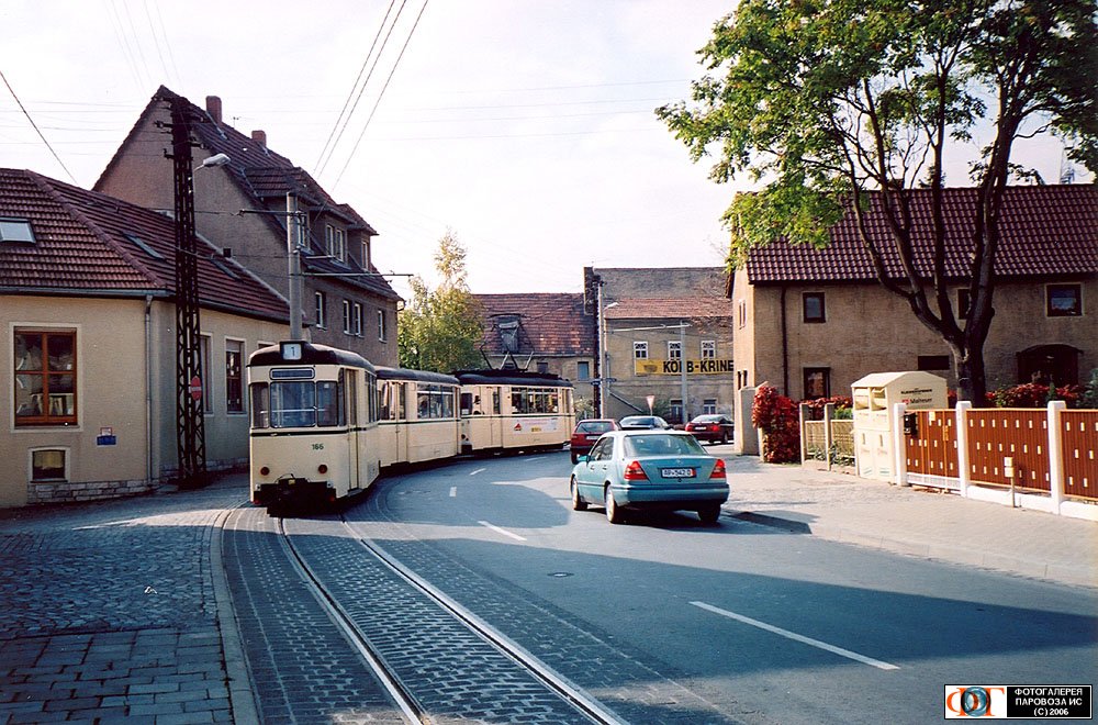 | Трамвайный поезд Gotha T57+B57+B57 в кривой на ул. Наумбургер между остановками Цветцен и Лёбштедт, Йена, Германия/Тюрингия Автор: Vladislav Prudnikov | Фото сделано 11.X.2002, опубликовано 14.II.2007.