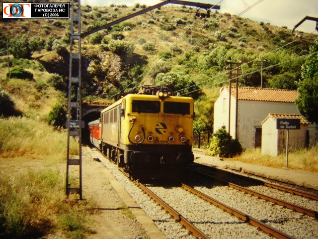 | Электровоз 269.914-8 с поездом "Тальго-3". О.п. Плата-де-Гарбет, Испания Автор: М.Шварц | Фото сделано VI.2004, опубликовано 5.V.2007.