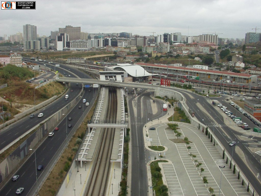 | Две станции Камполиде и электродепо { Campolide yard and stations }, Лиссабон { Lisbon }, Португалия Автор: Сергей Рублёв | Фото сделано 9.VII.2002, опубликовано 23.IX.2006.