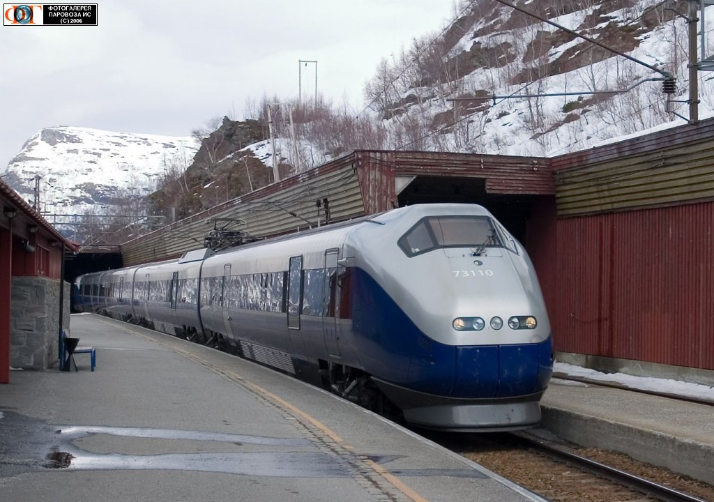 Электропоезд "Сигнатур" { Signatur train }, станция Мюрдаль { Myrdal station }, Норвегия