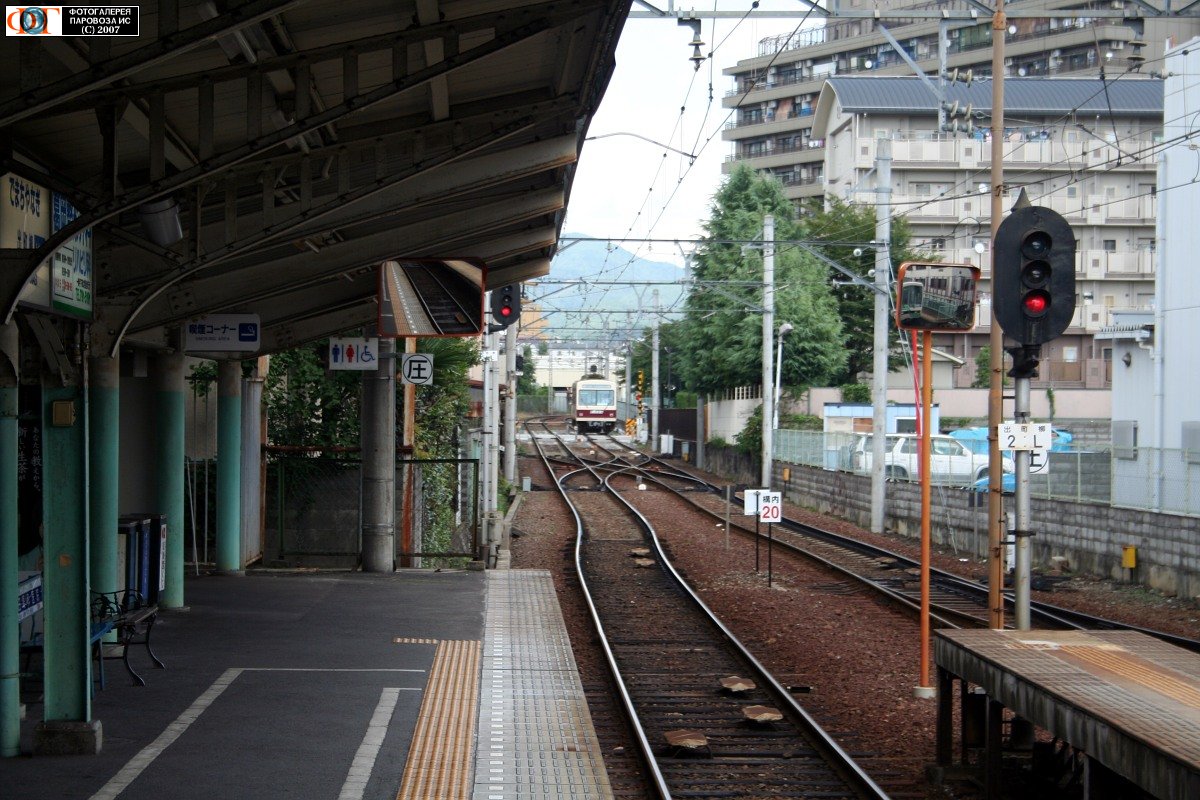 | Электромотриса компании "Эйдзан" прибывает на вокзал Дематиянаги, Киото, Япония Автор: Зиновьев Д. | Фото сделано 24.VIII.2007, опубликовано 2.IX.2007.