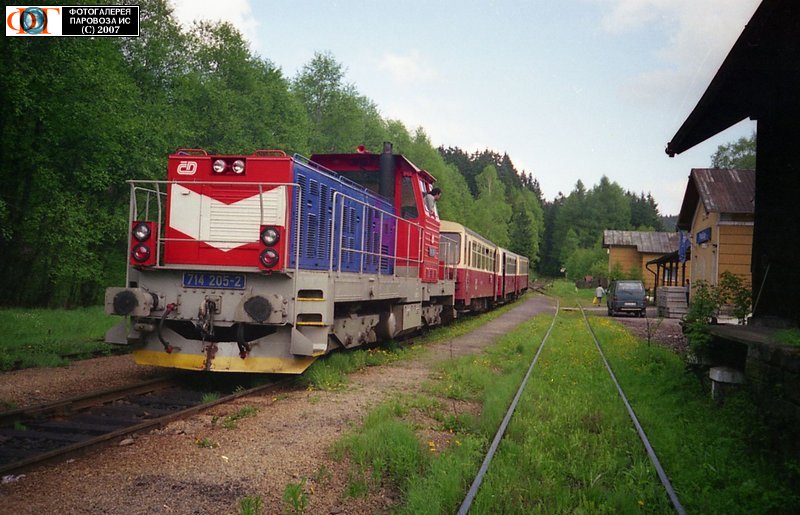 | Тепловоз 714.205-2 с пригородным поездом Карловы Вары - Потучки. Ст. Потучки, Чехия Автор: М.Шварц | Фото сделано V.1997, опубликовано 8.XII.2007.