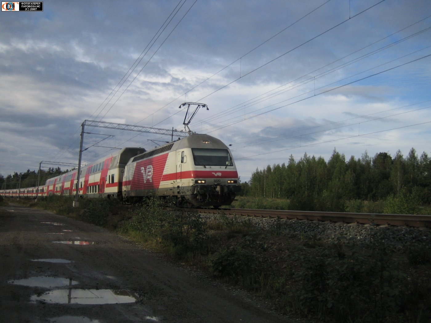 | Электровоз Sr2-3220 с поездом "Интерсити" на о.п. Лемпяля, Финляндия Автор: Хайми Л. | Фото сделано 2.IX.2007, опубликовано 10.I.2008.